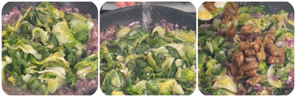 Zodra het water volledig is verdampt, voeg de andijvie toe, voeg zout toe en meng goed. Voeg vervolgens de ontpitte olijven toe en blijf roeren.