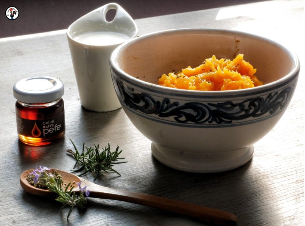 Doe het pompoenvlees in een hoge beker, met een snufje zout en een theelepel fijngehakte verse rozemarijn. Mix met de staafmixer tot een zachte, smaakvolle en homogene room. Verlengen met de room, terwijl u blijft blenden, totdat de gewenste consistentie is bereikt. Er zullen ongeveer 3 eetlepels nodig zijn.