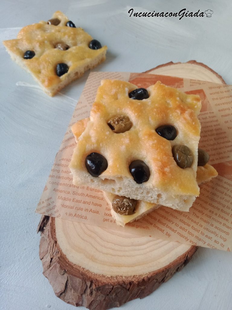 Focaccia met olijven, zacht en smaakvol, met een intense geur van olijven is heerlijk warm, net uit de oven, of koud voor snacks, tussendoortjes, voorgerechten of buffetten 😋