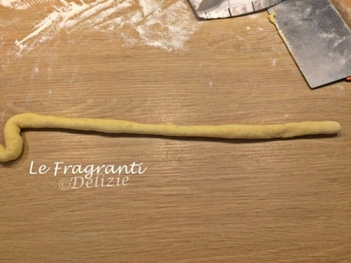 Neem telkens een beetje deeg en vorm rolletjes op de werkbank met een dikte van ongeveer 2 cm. (de dikte van een vinger).
