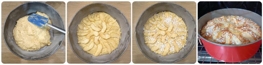 • Giet het mengsel in een springvorm met een diameter van 22 cm (als je die niet hebt, kan een ovenvorm van dezelfde grootte worden gebruikt) die ingevet en met bloem bestoven is. Versier de taart met de overgebleven appelplakjes bovenop en strooi royaal suikergranulaat erover.