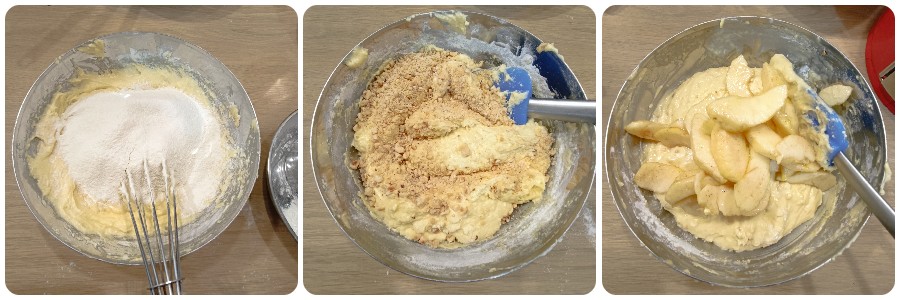 Voeg ook de hazelnoten toe en tot slot de appels, waarbij je 25 plakjes apart houdt die je zult gebruiken om de appel- en hazelnoottaart te versieren voordat je hem in de oven zet.