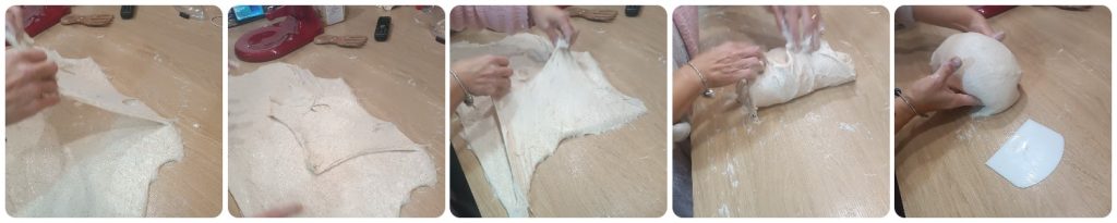 Na de tijd, plaats het deeg op een werkblad, maak je handen nat en rek het uit zoveel je kunt proberen om een rechthoek te vormen (laminering van het deeg). Pak een buitenste rand van de rechthoek en breng deze naar het midden van het deeg. Doe hetzelfde met de andere hoeken. Rol het deeg op zichzelf, vorm een bol en plaats het opnieuw in de kom. Bedek en laat ongeveer 45 minuten rusten.