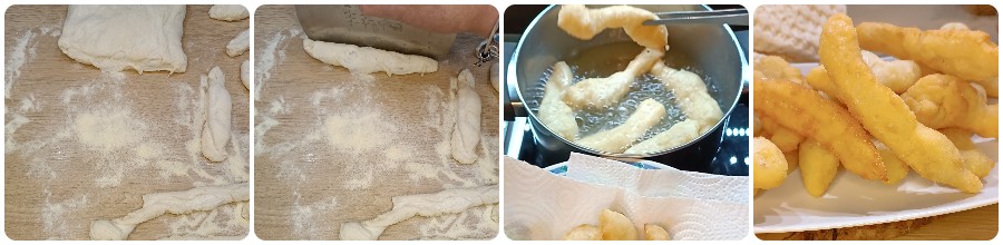 Rek het deeg uit met je handen en let op dat je het niet te plat maakt (dat zorgt ervoor dat de engeltjes zachter en luchtiger blijven), en snijd strepen van ongeveer 7-8 cm met een pizzasnijder of snijwieltje.
