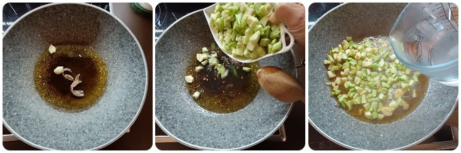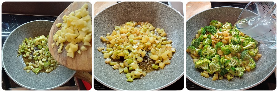 • Verwarm in een pan de extra vierge olijfolie en het teentje knoflook dat schoon en doormidden gesneden is. Voeg na een paar minuten de 2 ansjovisfilets in olie toe. Wanneer deze zijn opgelost, voeg je de fijngehakte broccolistelen toe. Voeg wat warm water toe en kook op middelmatig laag vuur.