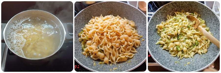 • Zet ondertussen een pan met water en zout op, en wanneer het kookt, kook de pasta al dente.