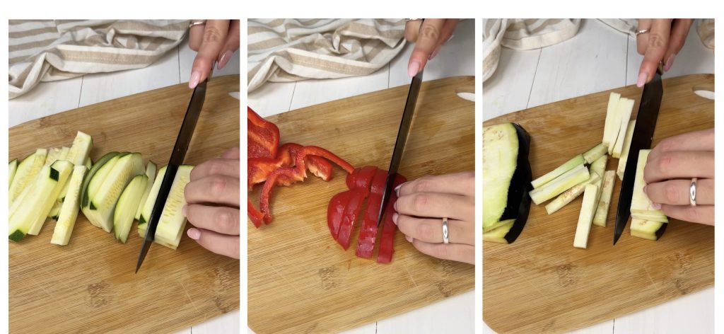 Snijd eerst de groenten in sticks van ongeveer 10 cm, zoals een aubergine, een courgette en een paprika.