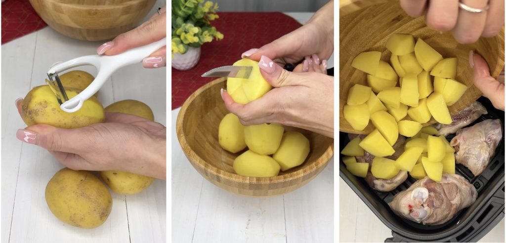 Ondertussen bereiden we de aardappelen voor; we schillen en snijden ze in blokjes. Haal het lam uit de marinade en verwijder de vloeistof. Doe het lam in de mand van de airfryer, voeg de aardappelen eromheen toe (zonder ze te veel op het vlees te stapelen) en de kruiden van de marinade. Eindig met een scheutje EVO-olie bovenop en een snufje zout op het vlees en de aardappelen.