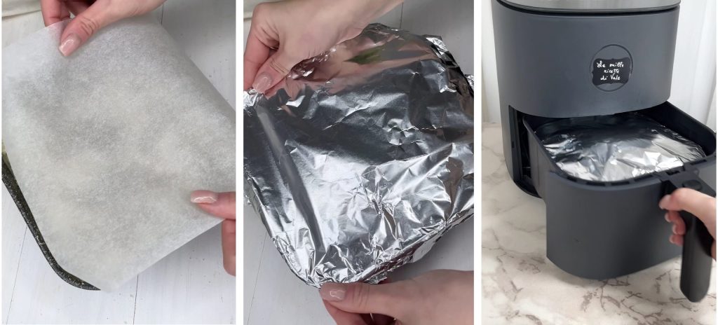 Bedek met een vel bakpapier en sluit goed af met aluminiumfolie. Bak in de airfryer op 180 graden gedurende 20 minuten, waarbij je de dekking in de laatste 5 minuten verwijdert om de bovenkant te gratineren. Of je kunt ze in een hete oven bakken op 200 graden gedurende 40 minuten.