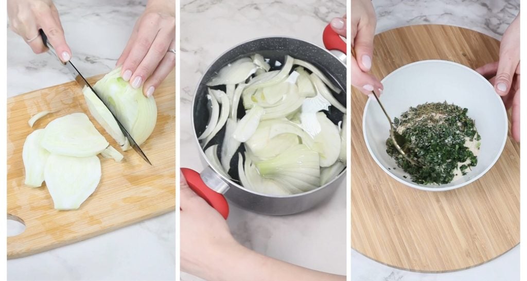 • We wassen de venkel en snijden deze in plakken van ongeveer 1 cm dik; we plaatsen ze in een pan met ruim gezouten water en laten ze ongeveer een half uur koken.