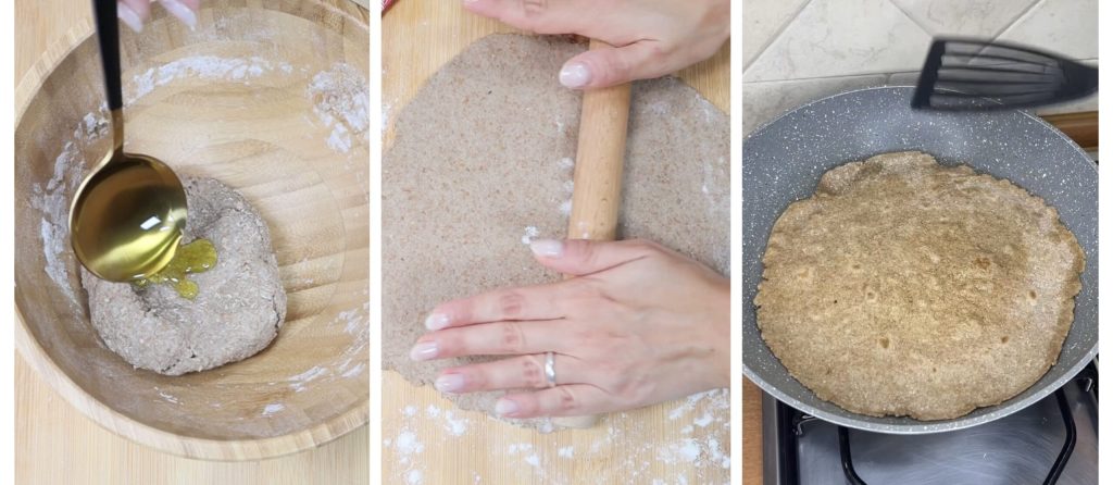 Verdeel het deeg in tweeën en rol de vellen dun uit met een deegroller. Ze moeten heel dun zijn. Bak ze in een ingevette antiaanbakpan met een beetje extra vergine olijfolie 2 minuten per kant. Laat ze afkoelen.