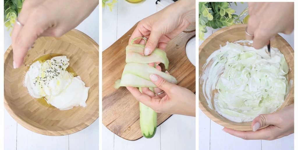 • Ondertussen bereiden we de tzatziki-salade voor. In een kom doen we de Griekse yoghurt, de azijn, de extra vergine olijfolie, het zout, de bieslook en een geperste of fijngehakte knoflookteen. Ik heb het niet toegevoegd, maar je kunt het gerust toevoegen. Ten slotte kun je ook munt toevoegen. Roer met een lepel. Maak ook de komkommers schoon door de schil te verwijderen, snijd ze dan heel fijn met een eenvoudige dunschiller, zodat je “spaghetti” van komkommers krijgt. Voeg ze toe aan de tzatziki-saus en meng.
