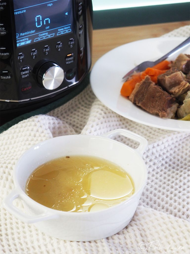 Voor mij betekent het bereiden van bouillon het combineren van traditie met moderne gemak. Ik ontdekte dat met mijn Instant Pot, die volle, heldere en diepe smaak gemakkelijk te bereiken is: slechts een paar eenvoudige ingrediënten, een ontspannen kooktijd, en meteen verspreidt zich die geur in de keuken die naar familie en serene momenten ruikt.
