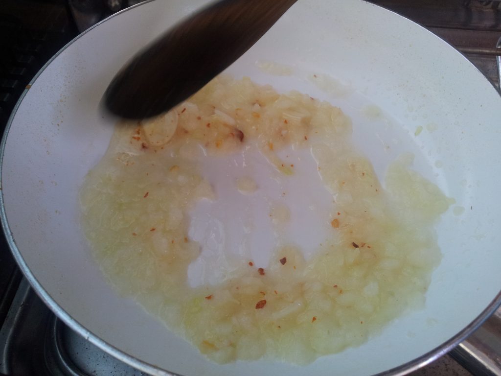 Voeg in dezelfde pan de fijngehakte bieslook en het halve teentje knoflook toe. Fruit alles totdat de knoflook zijn smaak afgeeft (verwijder het dan uit de pan). Voeg vervolgens een snufje chilipoeder toe voor een pittige toets.