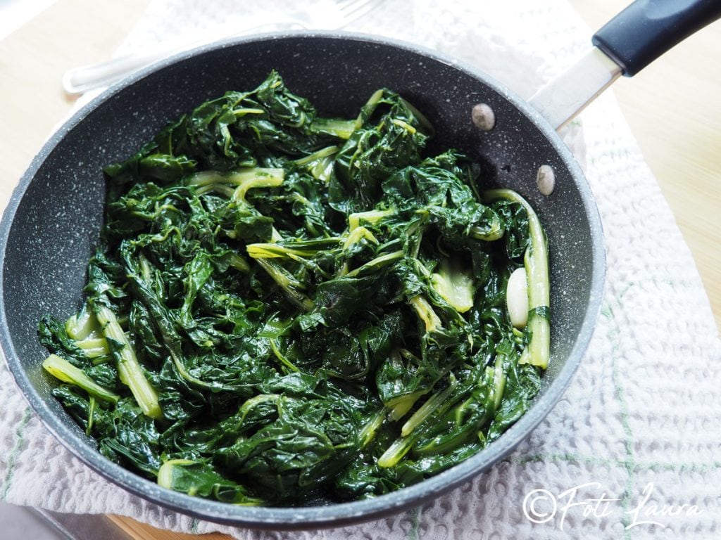 Opmerking: Als je wilt, kun je de stelen van de bladeren scheiden en eerst de stelen in kokend water leggen, en na 3 minuten de bladeren toevoegen voor een gelijkmatigere garing.