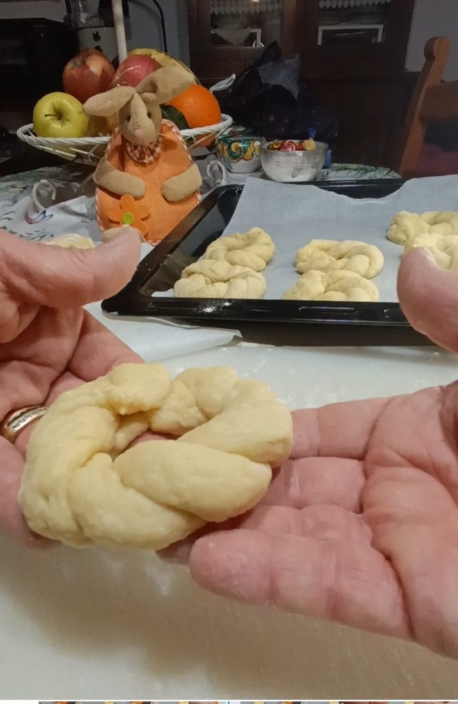 Doe de bloem, de suiker, de ammoniak of het bakpoeder en het zout in een kom en meng. Voeg de reuzel toe en bewerk met een vork. Voeg de eieren, de melk, de geraspte citroenschil, de vanilline en de limoncello toe en kneed tot een homogeen, zacht en glad deeg.