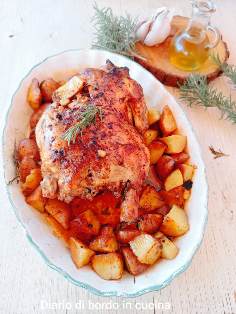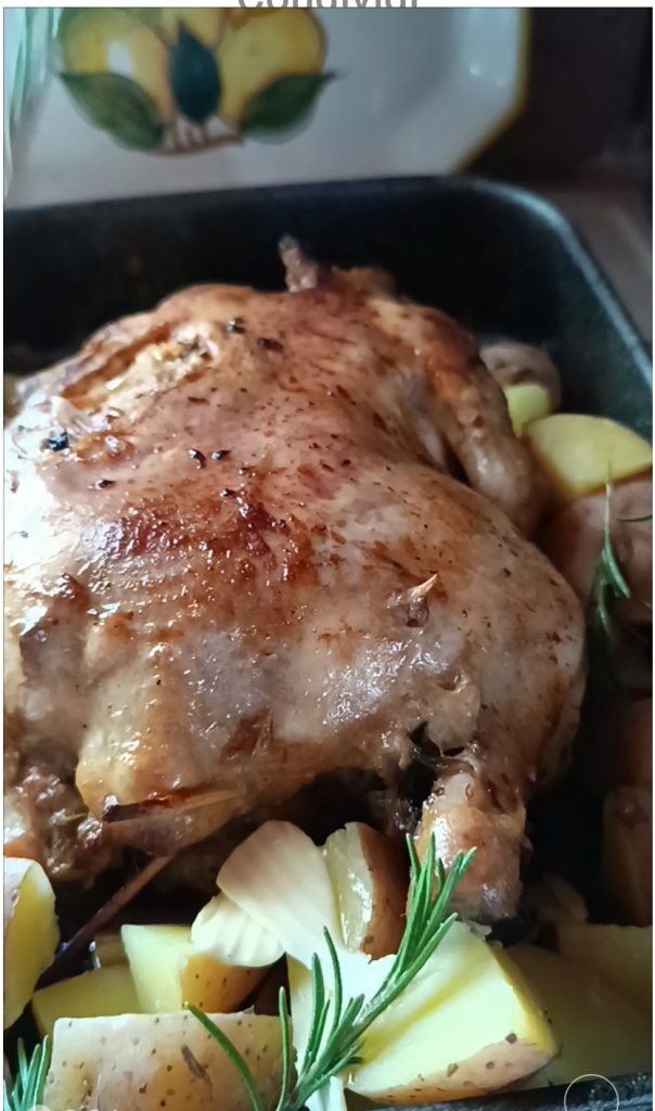 Leg het in een ovenschaal met olie, giet er een glas witte wijn overheen, smeer het in met olie en zout. Bak in een warme oven gedurende ongeveer een uur. Voeg halverwege de kooktijd de aardappelen toe, gesneden en eerder tien minuten geblancheerd in gezouten water.