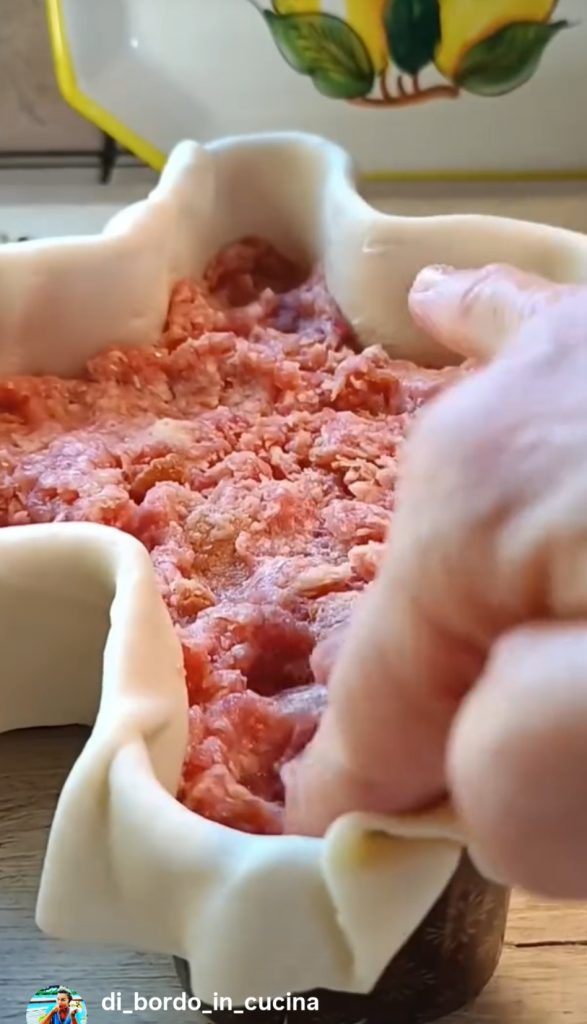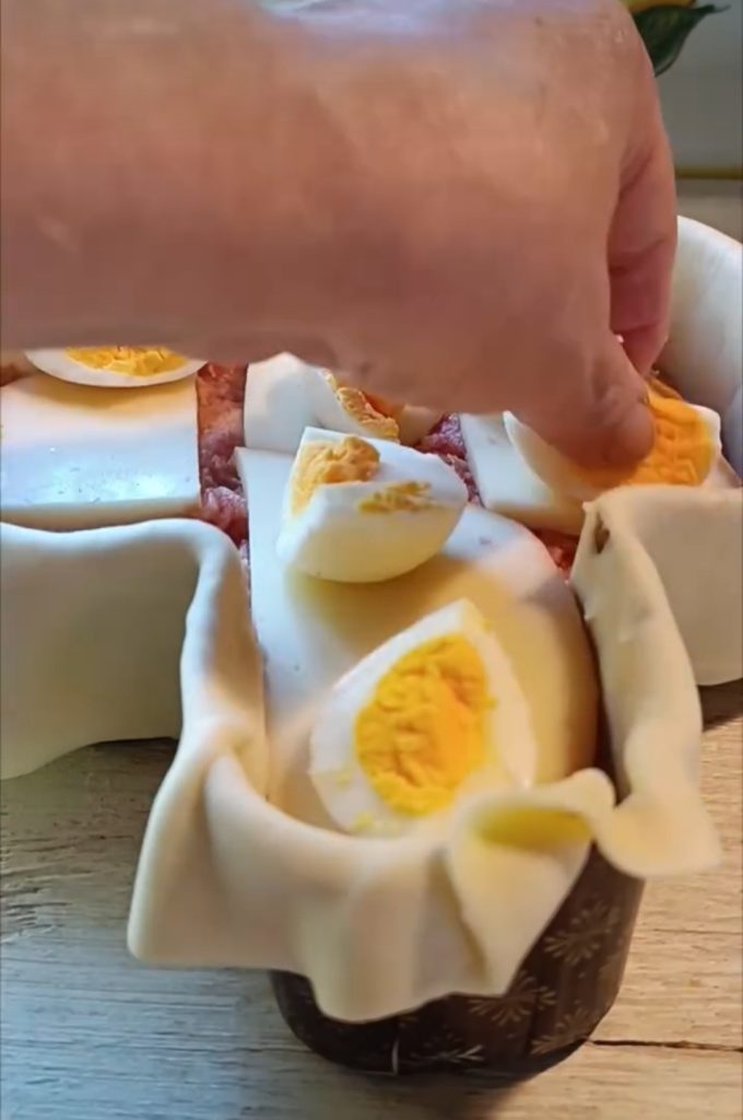 Leg er plakjes scamorza op, de gekookte eieren en de plakjes mortadella. Dek af met de andere helft van het gehakt. Leg enkele klontjes boter erop en bak ongeveer 40 minuten op 180°.