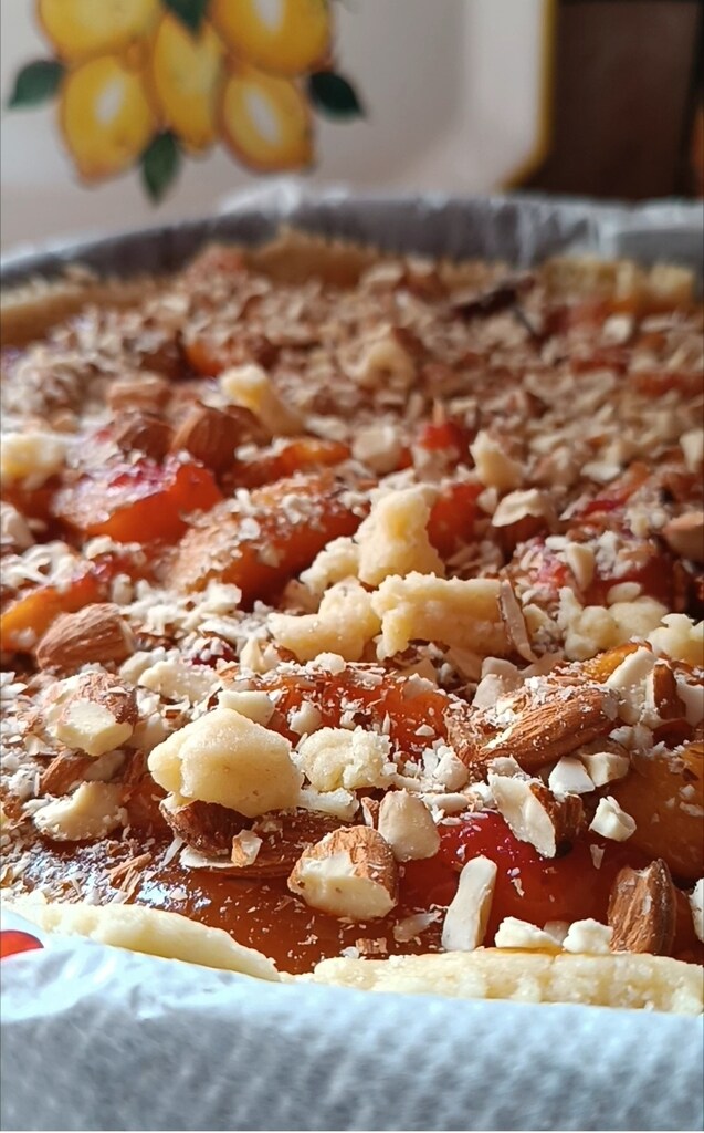 Perzikentaart met amandelcrumble is een heerlijk dessert om op elk moment van de dag van te genieten. Voor dit dessert kun je elke soort perzik gebruiken: geel, wit, tabacchiere. Je kunt je favoriete recept voor zanddeeg gebruiken, of het mijne volgen. De perziken zijn gekarameliseerd, de toevoeging van perzikjam maakt dit dessert echt onweerstaanbaar!