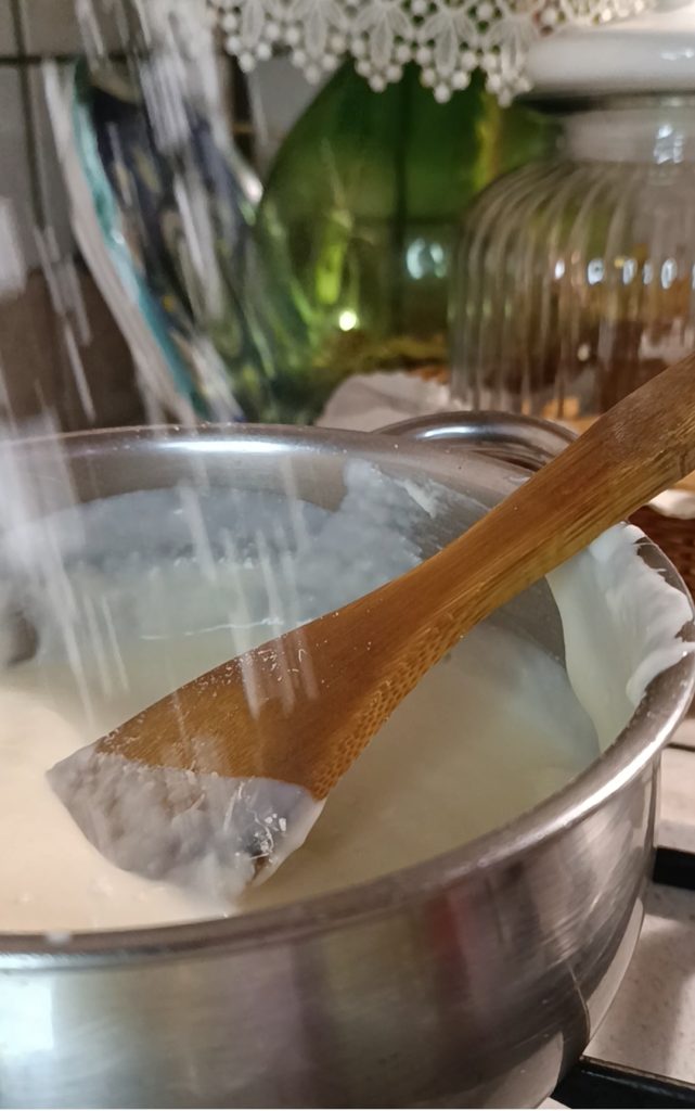 Giet de parmezaancrème die je eerder hebt bereid: smelt de boter en meng met de bloem. Voeg de warme melk en het zout toe, roer op laag vuur en laat indikken. Voeg tenslotte al roerend de Parmezaan toe.