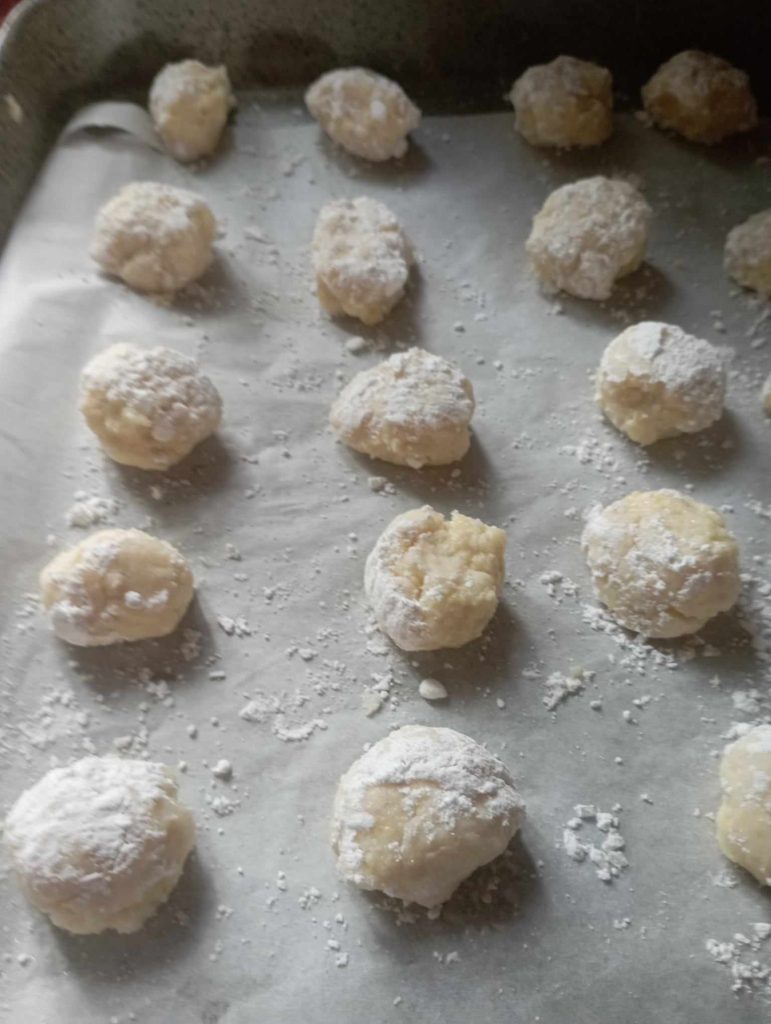 Nadat het deeg gemaakt is, bereid een bakplaat bekleed met bakpapier voor. Doe voldoende poedersuiker in een schoteltje. Vorm met licht bevochtigde handen bolletjes, ongeveer van hetzelfde gewicht. Nadat de bolletjes gevormd zijn, rol ze door de poedersuiker en plaats ze op de bakplaat.