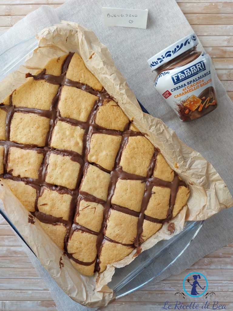 We gieten het mengsel in de vorm en nivelleren het oppervlak. We nemen nu de spuitzak en vullen deze met de cacaocrème en gezouten karamel van Fabbri 1905. We decoreren het oppervlak van de taart, zonder druk uit te oefenen, met de klassieke diagonale lijnen van de quilt of pluim of plaid, de deken van oma zou je kunnen zeggen. Als je wilt, kun je ook het oppervlak bestrooien met witte suiker of rietsuiker. We zijn eindelijk klaar om de taart in de oven te zetten!