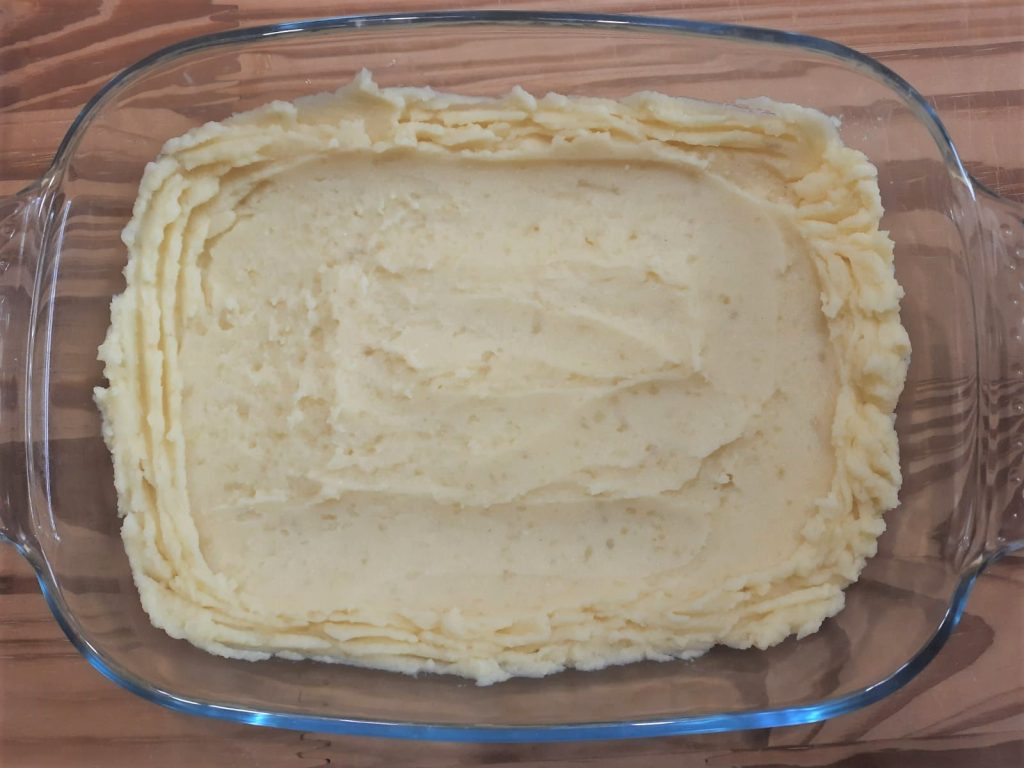 Gewoonlijk worden de ingrediënten allemaal samen gemengd, maar bij ons thuis geven we er de voorkeur aan eerst de gepureerde aardappelen te kruiden om ze nog smaakvoller en lekkerder te maken, en vervolgens de vulling in een middelste laag toe te voegen.
