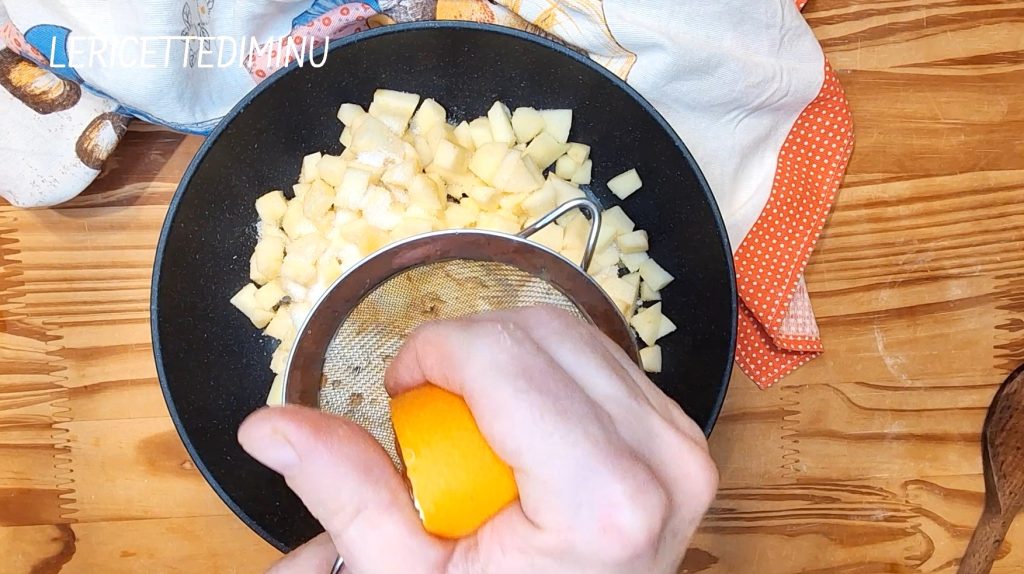 Snijd ze in stukjes en doe ze in een anti-aanbakpan met de suiker, kaneel en het gezeefde sap van 1 sinaasappel.
