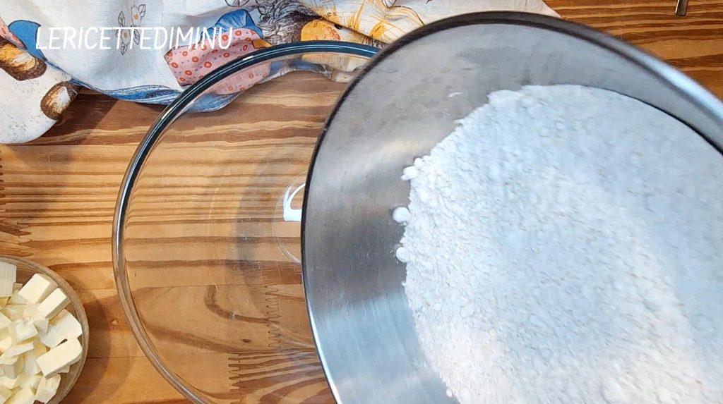 Verzamel in een grote kom de bloem, suiker, bakpoeder, een snufje zout, de geraspte biologische sinaasappelschil, het ei en de koude boter in stukjes.