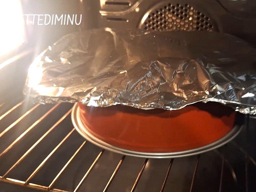 Na de eerste 25/30 minuten, als je merkt dat het oppervlak van de taart te veel verkleurt, open dan de oven voor een paar seconden en bedek de taart met aluminiumfolie of, als je dat liever hebt, met bakpapier dat in contact is met de taart en dan aluminiumfolie.