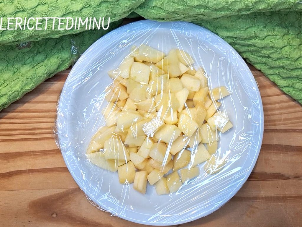 Maak twee appels schoon en snijd ze in blokjes, dek het bord af met huishoudfolie zo goed mogelijk aanrakkend.