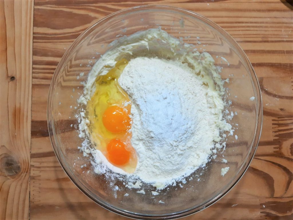 Als je een goed gemengd mengsel hebt verkregen, voeg je de gezeefde bloem met het bakpoeder toe en blijf je werken terwijl je de eieren toevoegt.