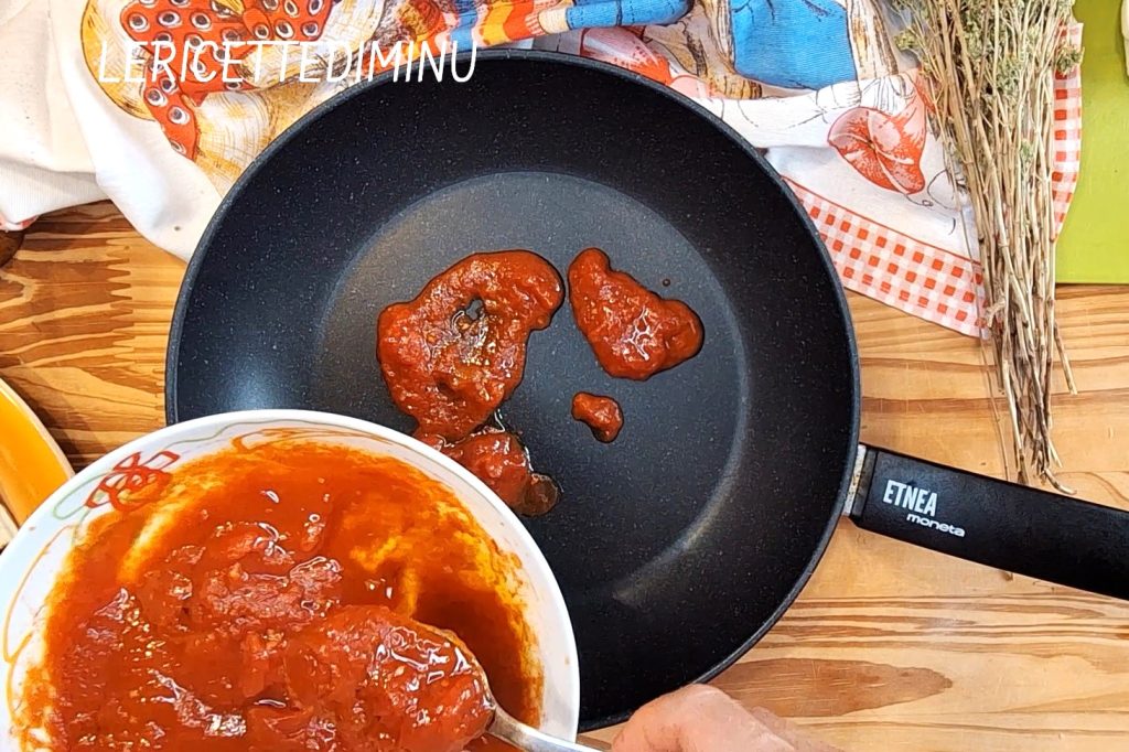 • Op de bodem van een antiaanbakpan enkele lepels gekookte saus en enkele theelepels water verdelen, op smaak brengen met een beetje oregano en versgemalen zwarte peper.
