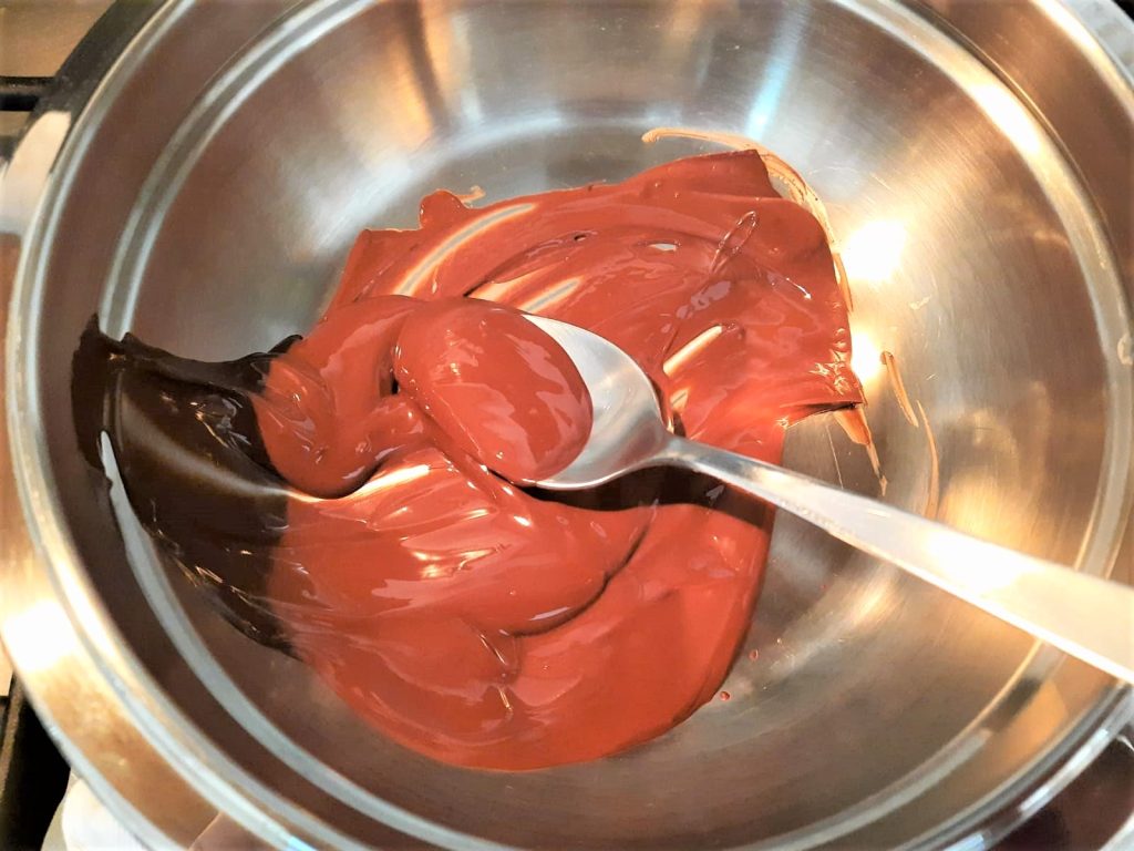• Op dit punt, smelt de chocolade au bain-marie en laat het een paar minuten afkoelen zodat het niet te vloeibaar is.