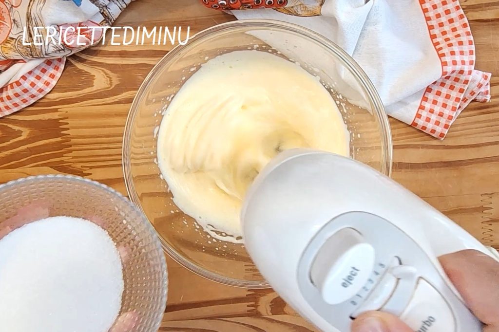 Voeg dan de suiker toe terwijl u blijft kloppen, gevolgd door de gesmolten boter, die inmiddels enigszins is afgekoeld.