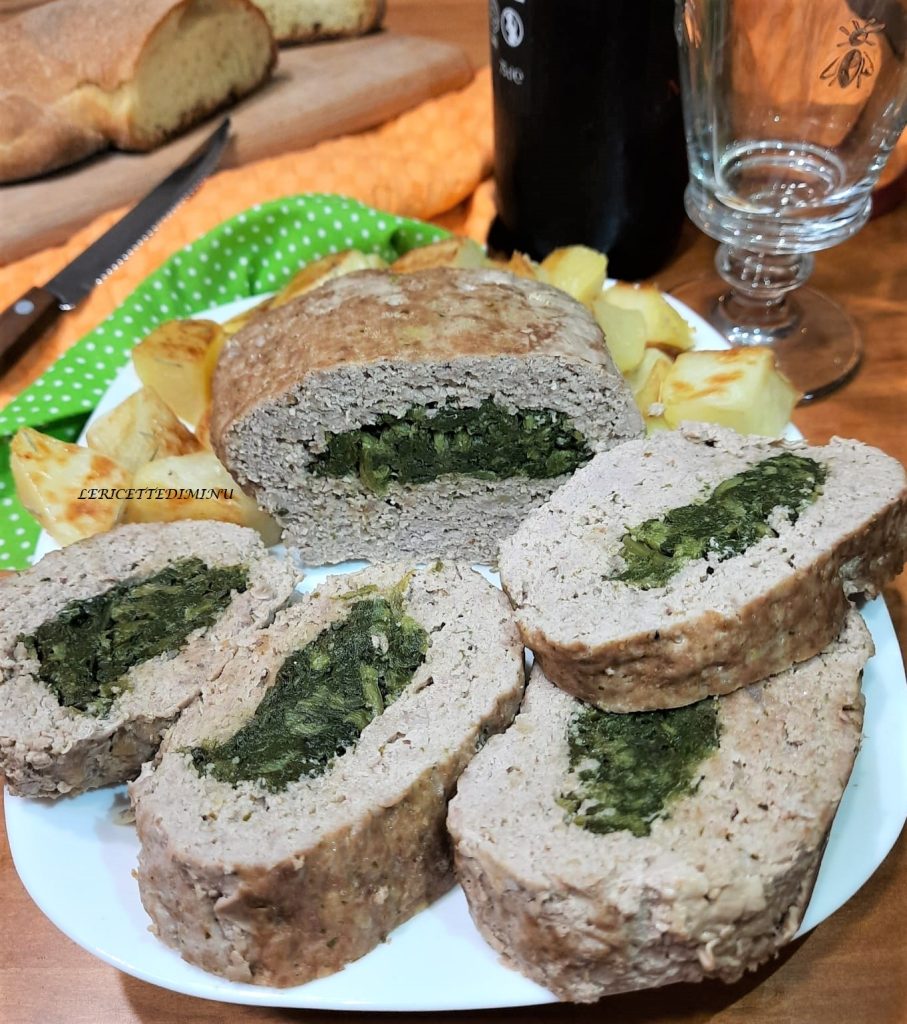 Zeer smaakvol dankzij de toevoeging van mortadella aan het deeg, presenteert dit gehaktbrood zich heel goed met zijn zachte spinazievulling en doet het erg denken aan dat gehaktbrood van een bekende merk dat al kant-en-klaar in de supermarkt te koop is.