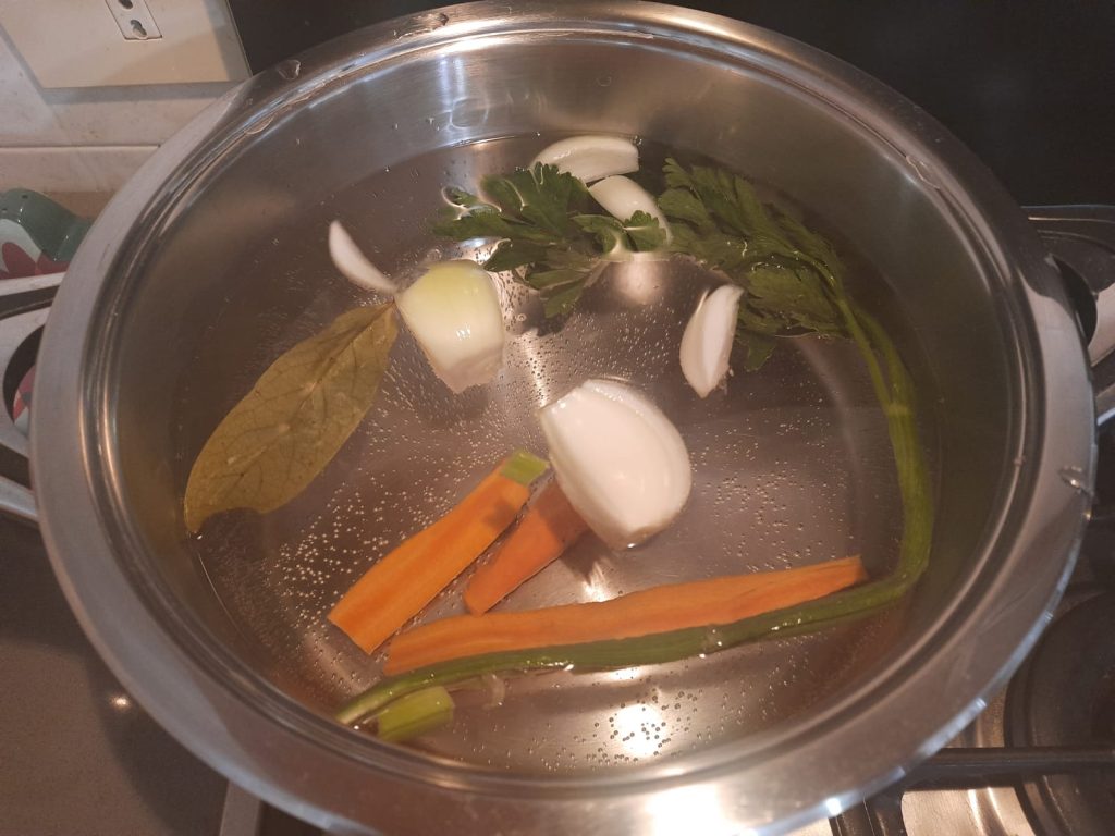 Maak ondertussen in een grote braadpan een groentebouillon met ui, wortel, bleekselderij en laurierblad.