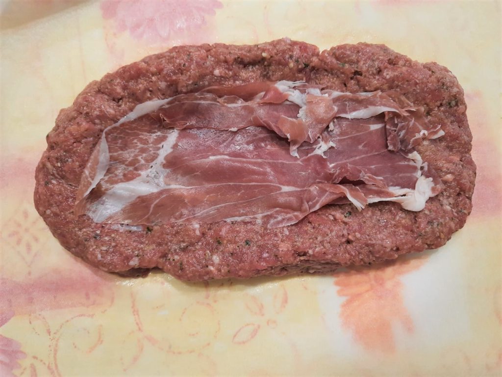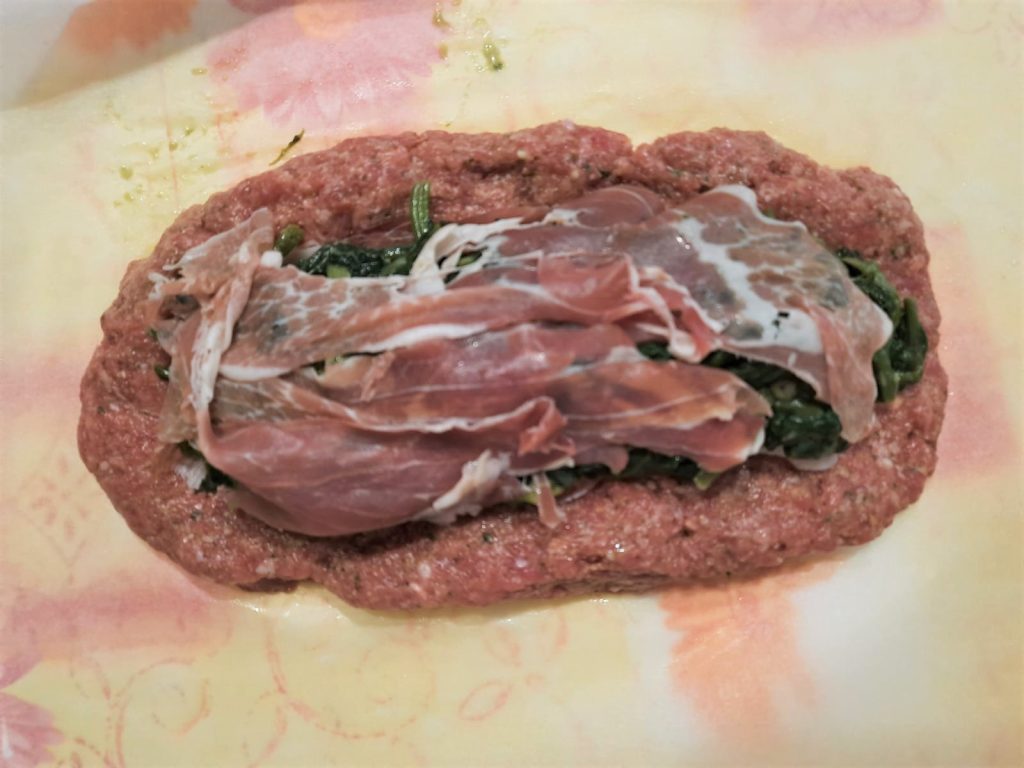 Op een groot vel bakpapier lichtjes besmeurd met olie, verdeelt u meer dan de helft van het mengsel, waarbij u een holte in het midden creëert waarin u twee dunne plakjes rauwe ham legt en daarop de spinazie die u uit hun bouillon hebt gehaald.
