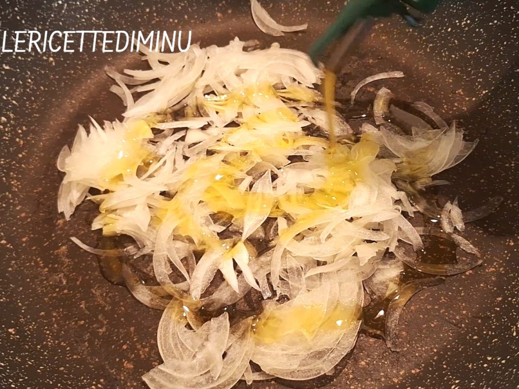 Ineen grote pan met hoge zijkanten of in een brede pan, bij voorkeur met antiaanbaklaag, laat je een halve gedroogde ui (gesneden met de mandoline) goudbruin worden in een royale hoeveelheid extra vierge olijfolie.