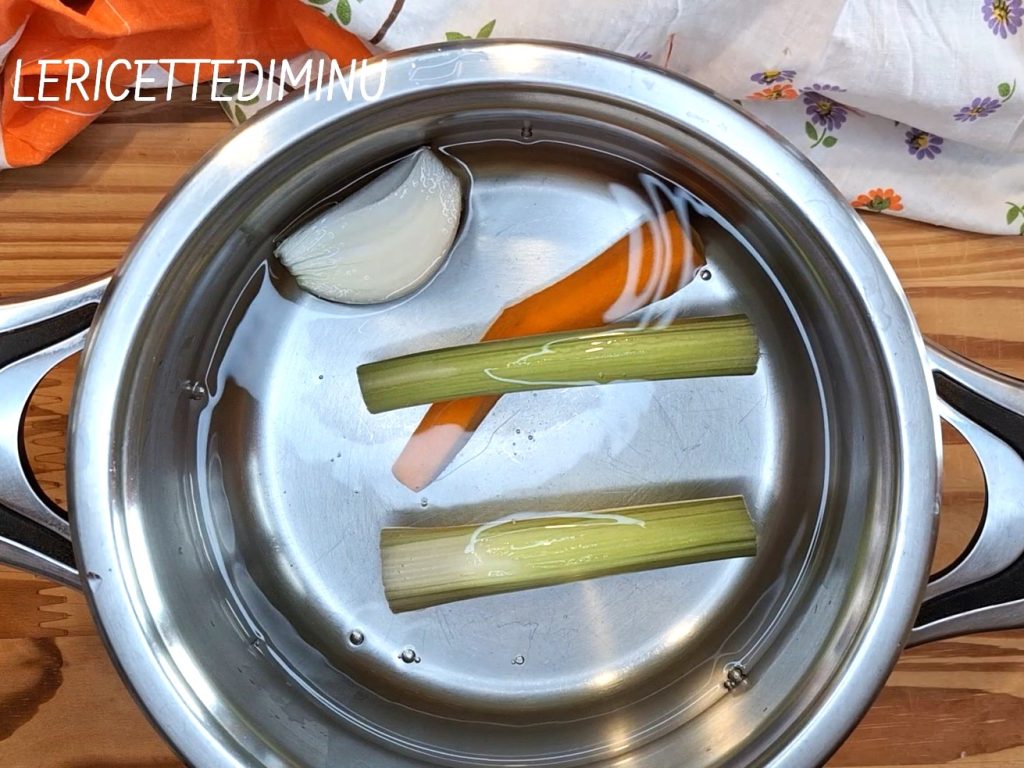 In een ruime pan ongeveer 2 liter water, de schoongemaakte en gesneden groenten, de vis- en langoustinekoppen en een matige snuf grof zout.
