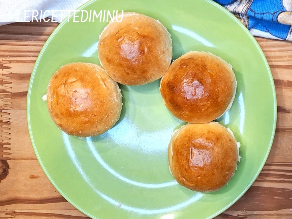 Begin met het halveren van de melkbroodjes, bij voorkeur met een broodmes, en verwijder de kruim zowel van de bovenkant als van de onderkant (voor het recept klik hier).