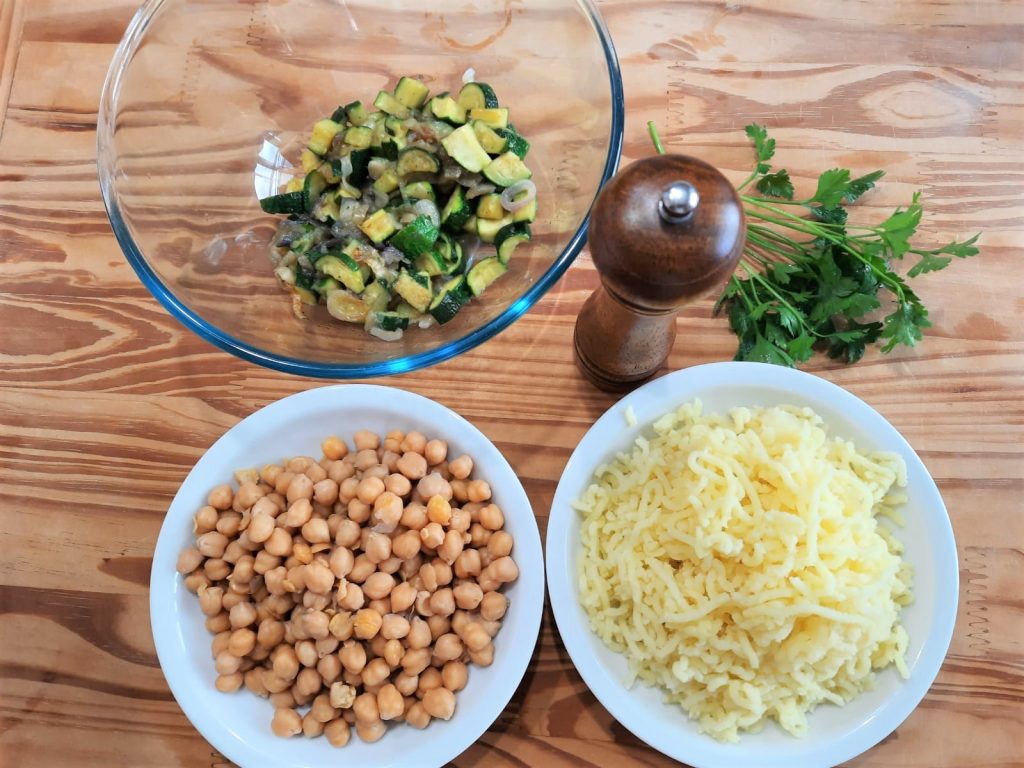 In een grote kom combineer je de afgekoelde en uitgelekte kikkererwten, de aardappelen zonder schil en fijngeperst, de courgettes, de peterselie, een matige hoeveelheid zout en zwarte peper, liefst versgemalen.