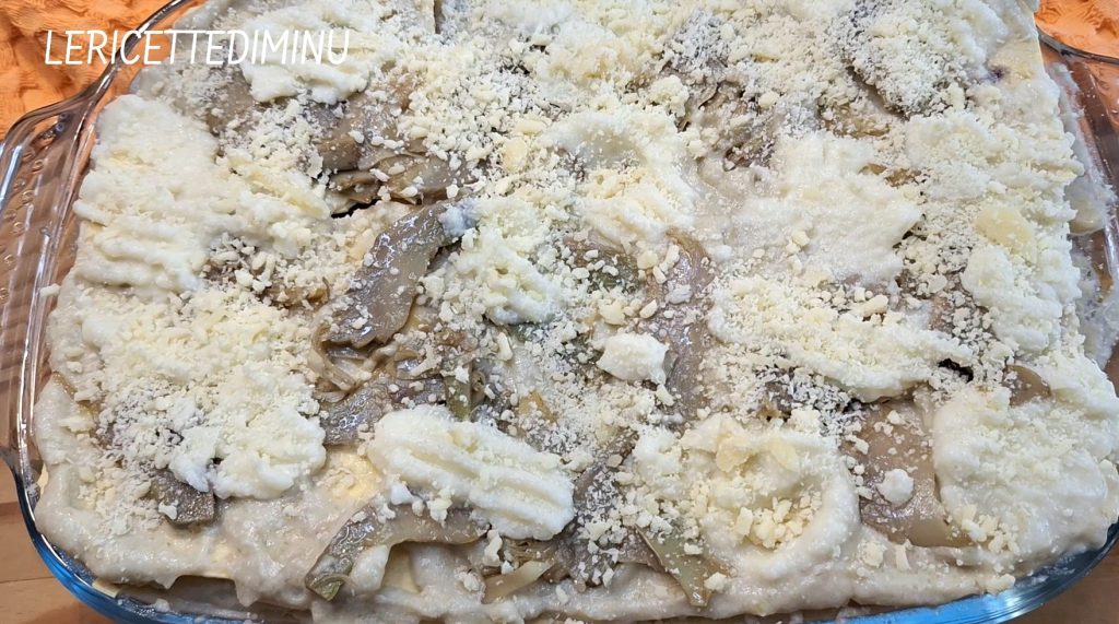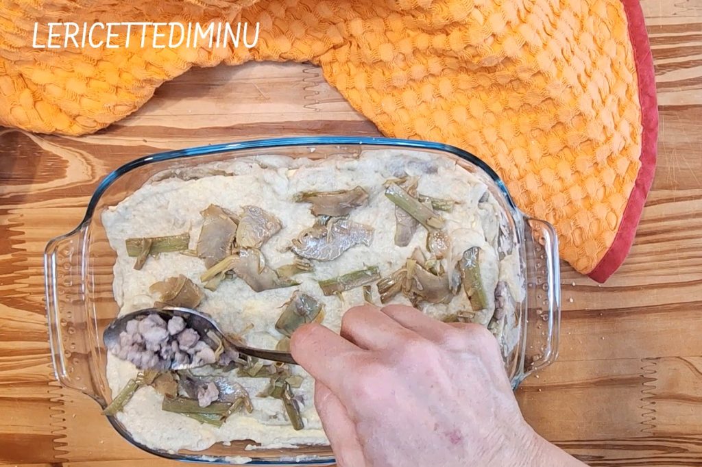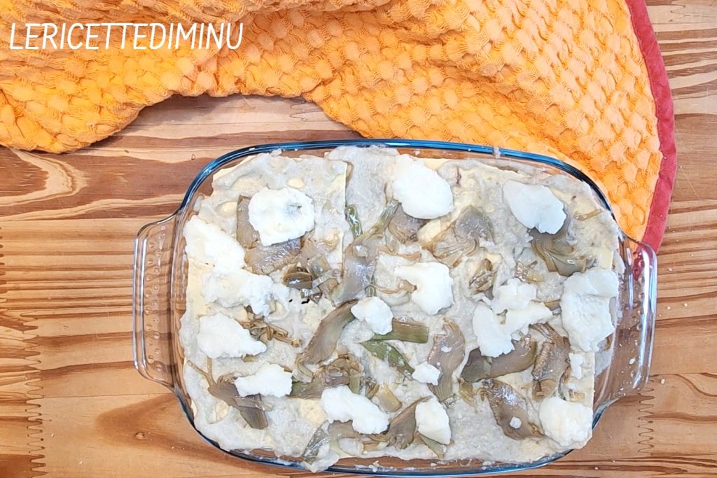 Leg vervolgens de droge lasagne zonder ruimtes over te laten en verdeel daarover een beetje bechamelsaus met artisjokken.