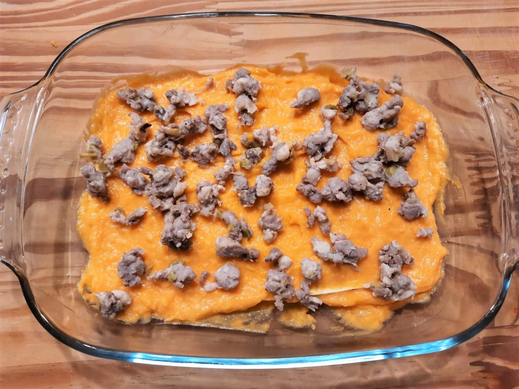 De lasagne met pompoen, worst en zoete provola is nu klaar.