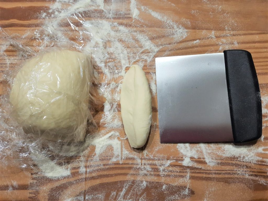 Na deze tijd, met behulp van een deegschraper-snijden, maak je van het deeg dikke schijven van ongeveer 2 cm en plat ze met je handen op een goed met bloem bestoven werkblad.