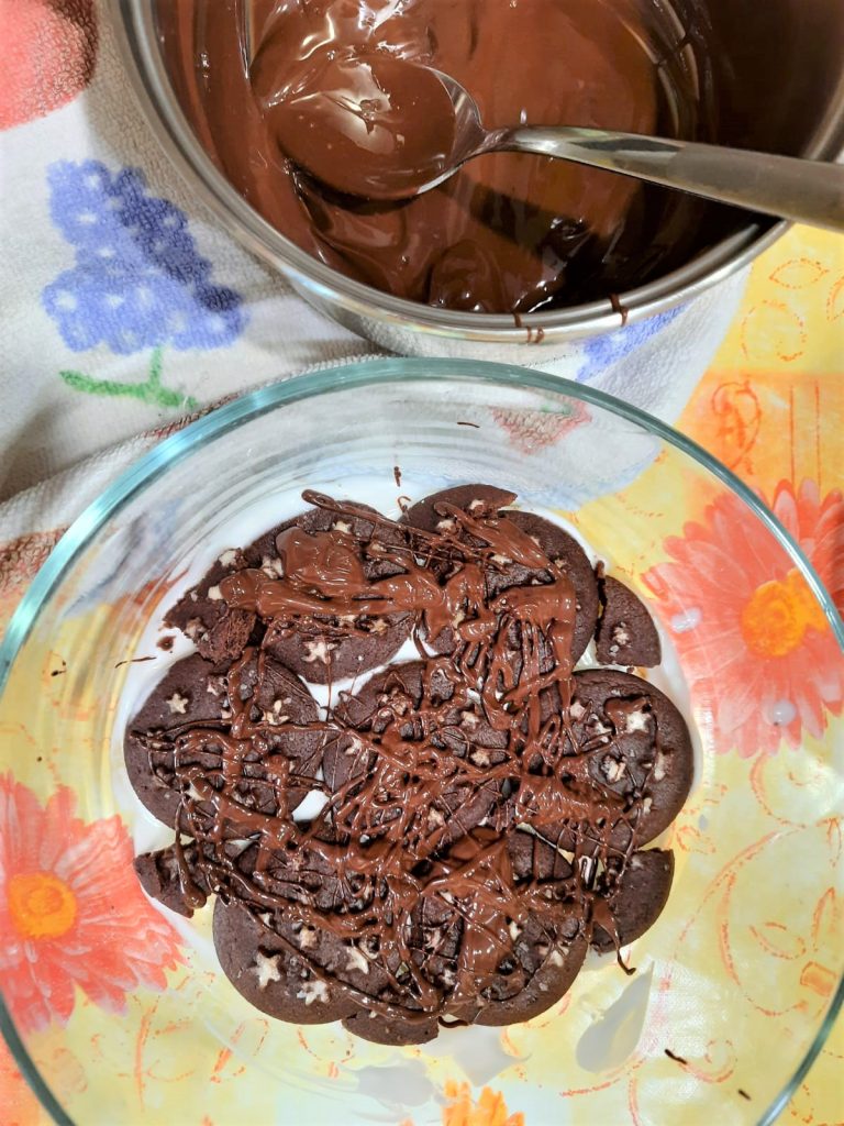 Eindig met twee of drie verkruimelde koekjes aan de bovenkant en, indien gewenst, met een raster van gesmolten chocolade die over de kruimels is gegoten.