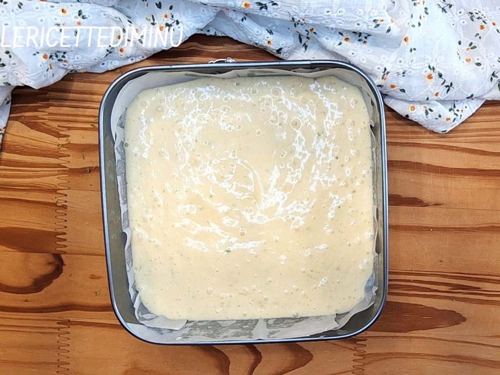 Giet het homogeen verkregen mengsel in een vierkante springvorm van 20×20, ingevet en met bloem bestrooid of, zoals ik het liever heb gedaan, ingevet en bekleed met op maat gesneden bakpapier.