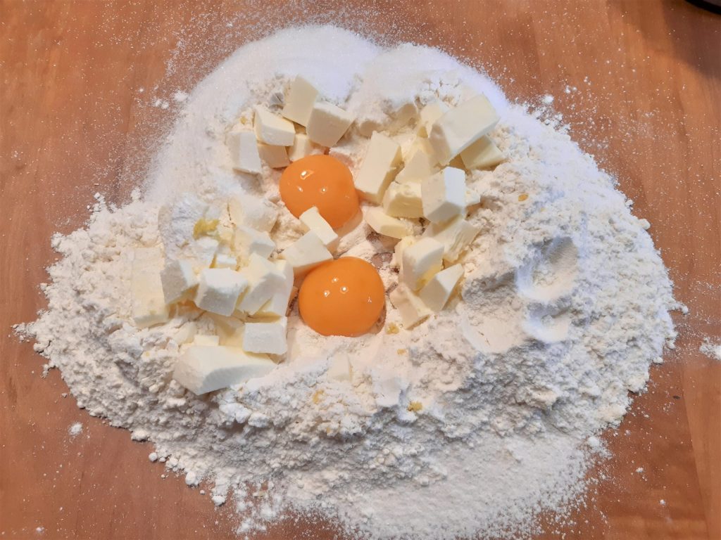 Spreid de gezeefde bloem met het bakpoeder, de suiker, een snufje zout, de geraspte schil van een halve citroen en voeg in het midden de zachte boter en de eidooiers toe op een werkblad.