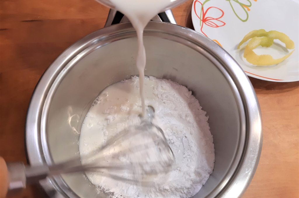 Voeg de zaadjes van een vanillestokje of het zakje vanilline toe en de schil van een halve citroen, waarbij je voorzichtig de witte pulp vermijdt, die een bittere smaak zou geven.