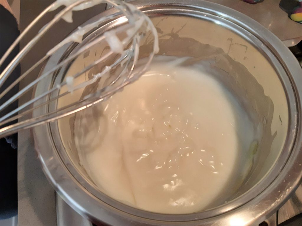 De room, die door afkoeling een beetje is gestold, moet worden verwerkt met een elektrische garde totdat de gewenste consistentie is bereikt.